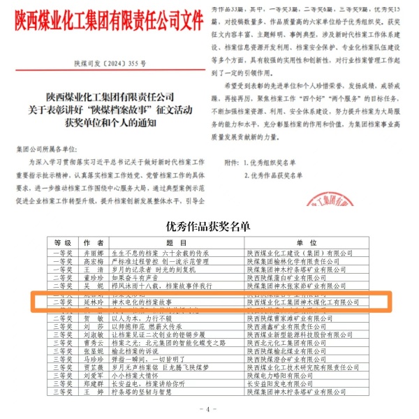 近日,陕西煤业化工集团有限责任公司发布《关于表彰讲好“陕煤档案故事”征文活动获奖单位和个人的通知》,电化公司凭借其精心编撰的《神木电化的档案故事》一文,从众多参赛作品中脱颖而出,荣获二等奖。
