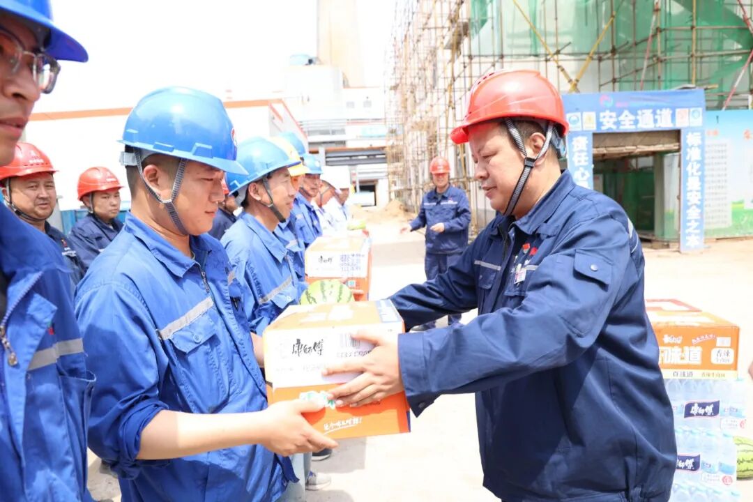 此次检修任务重、难度大、工期短,与此同时,2台电石炉和2#机组装置还处于正常运行状态。面对“检修+生产”紧迫态势,公司成立了“党员先锋队”“工会服务保障队”“青年突击队”,助力检修,保障服务。工会和机关党支部迅速响应,公司领导心系一线,第一时间将一箱箱泡面、矿泉水及一颗颗西瓜送到检修现场,递到大家手中,感谢大家在检修期间的辛劳付出,再三叮嘱作业时一定要注意安全,严格按照公司检修方案和安全保障措施,做好各项工序的有效衔接,以更饱满的斗志、更昂扬的状态、更严细的作风参与到检修工作中来,本着对岗位和企业负责的态度,坚守岗位、勇往无前。