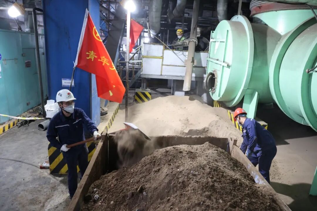 运渣车辆到达现场后,新的难题又摆在眼前,突击队员们发现根本无法使用机械设备进行装车。但这并没有难倒他们,大家迅速分组,两人一组默契配合,手持铁锹,轮流将灰渣一锹一锹奋力铲到车斗上。尽管现场尘土漫天飞扬,环境恶劣,但青年突击队员们个个精神抖擞,毫无退缩之意,始终冲锋在前。