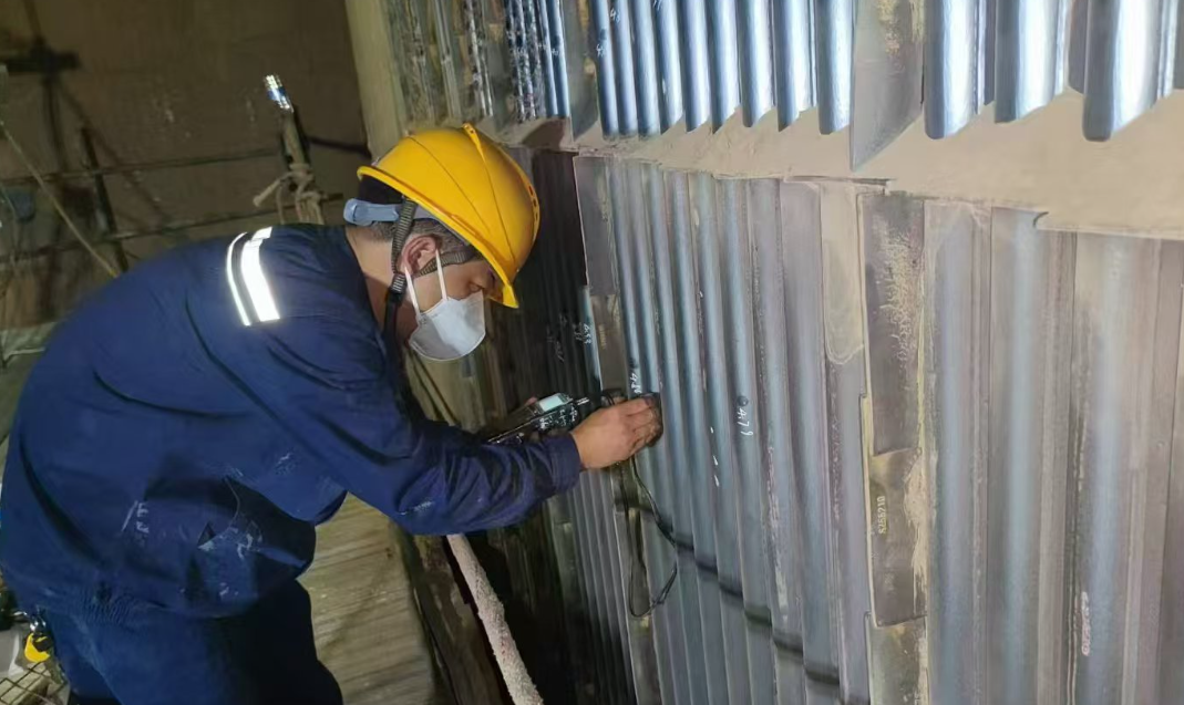 当笔者见到周元吉时,他正手持仪器对炉膛内水冷壁的磨损情况进行检查,在每根管壁上标记测量数值,为下一步检修工作提供确切的依据。据悉,周元吉和队友们需要对炉膛内的500多根水冷壁管、13000多个检测点进行逐一摸排、检测,汗水浸透了他们的衣服,流下了一片片“盐碱地”,但他们没有半句怨言。“水冷壁是锅炉的核心换热部件,长周期运行后的水冷壁会有不同程度的磨损,成为锅炉运行的重大安全隐患。因此对锅炉水冷壁检查必须认真、仔细,不能放过任何蛛丝马迹。”周元吉朴实的语言让人感受到他工作的认真与负责,不禁令人感叹电化人肩上那份沉甸甸的责任。