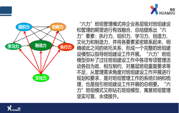 “六力”班组管理模式将企业各层级对班组建设和管理的期望进行有效融合,总结提炼出“六力”要素:执行力、组织力、学习力、创造力、文化力和制造力,并将各要素紧密联系起来,明确彼此之间的依托关系,形成一个完整的班组建设模型,以指导班组建设工作开展。